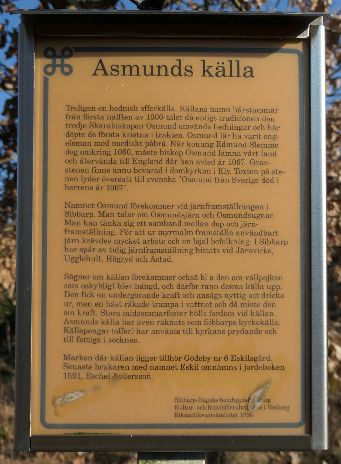 Asmunds källan är förmodligen en hednisk offerkälla. Namnet på källan kommer från första hälften av 1000-talet, då Osmund, den tredje Skarabiskopen, enligt traditionen omvände hedningar och döpte de första kristna i området.